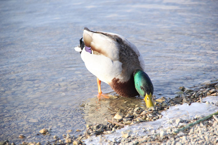 Son nom latin signifie à bec large (du grec [platos] = large, [rhynch] = bec). Et pour cause, avec le canard souchet il fait partie des canards français ayant le bec le plus large et cela joue un rôle majeur dans son alimentation. Le canard colvert est un canard de surface, également appelé “barboteur”. Il n’est pas en mesure de plonger et bascule son corps en avant, sous l’eau, son large bec fouille et retourne vase et végétation en quête de nourriture. Il est omnivore, il broute essentiellement de la végétation mais peut aussi consommer des larves, graines et peut aussi se nourrir en milieu terrestre dans des champs.