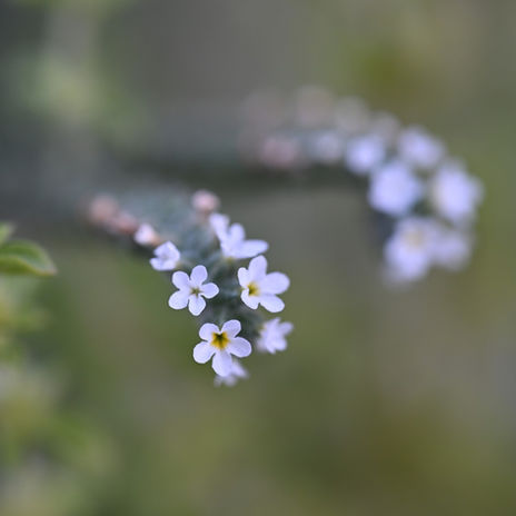 Les fleurs petites et blanches sont très nombreuses et regroupées en inflorescences denses en forme de queue-de-scorpion enroulée (typique de nombreuses borraginacées). Toutes les fleurs sont groupées d’un même côté (unilatérales) et très serrées. Les fleurs fanées donnent quatre fruits secs attachés : des akènes brun foncé (fruits secs à une seule graine).