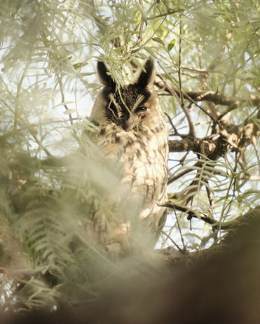 Lorsqu'il est dérangé de jour, le moyen-duc affine son corps et rétrécit son disque facial en fermant partiellement les yeux qui scrutent l'intrus.